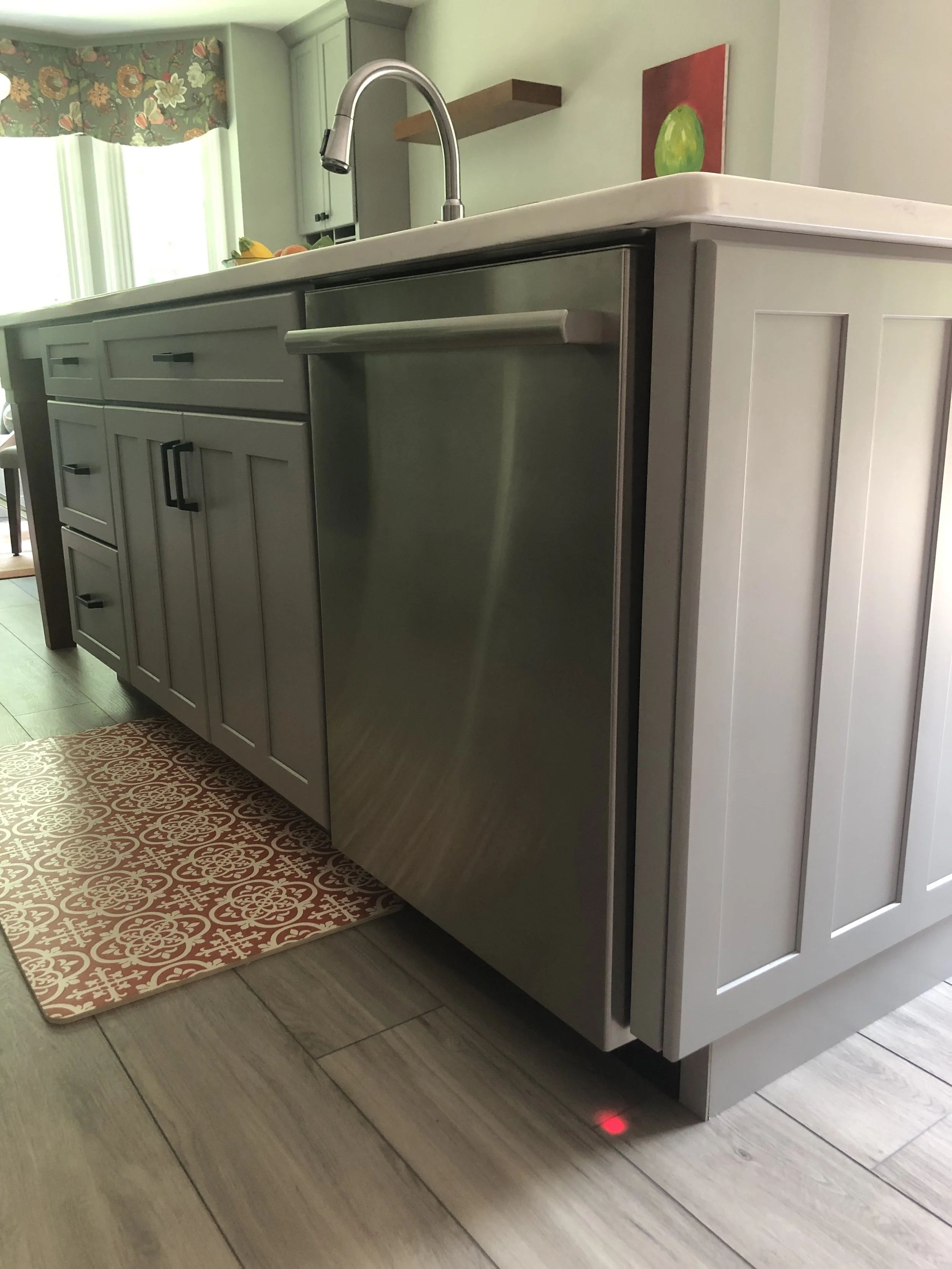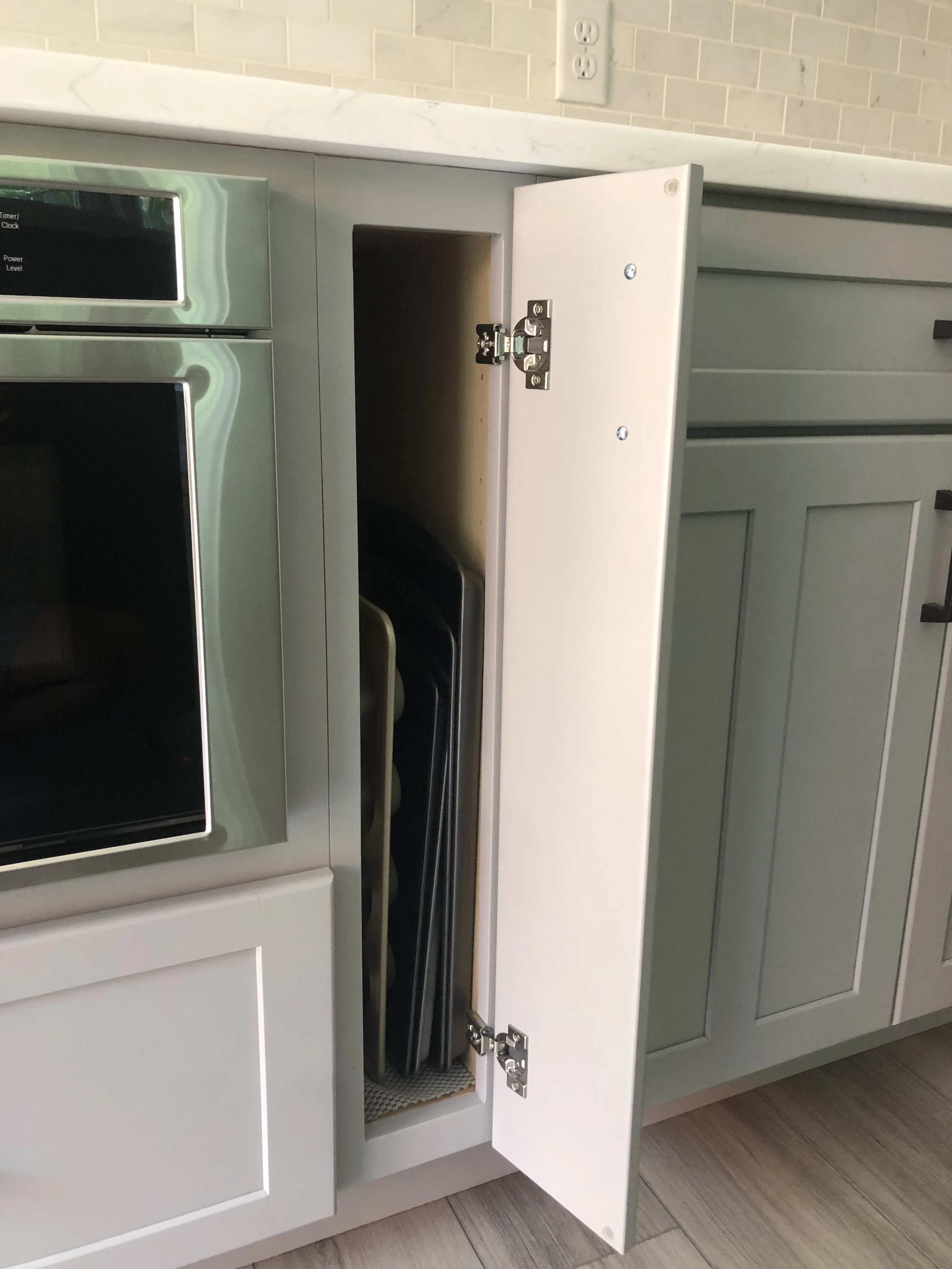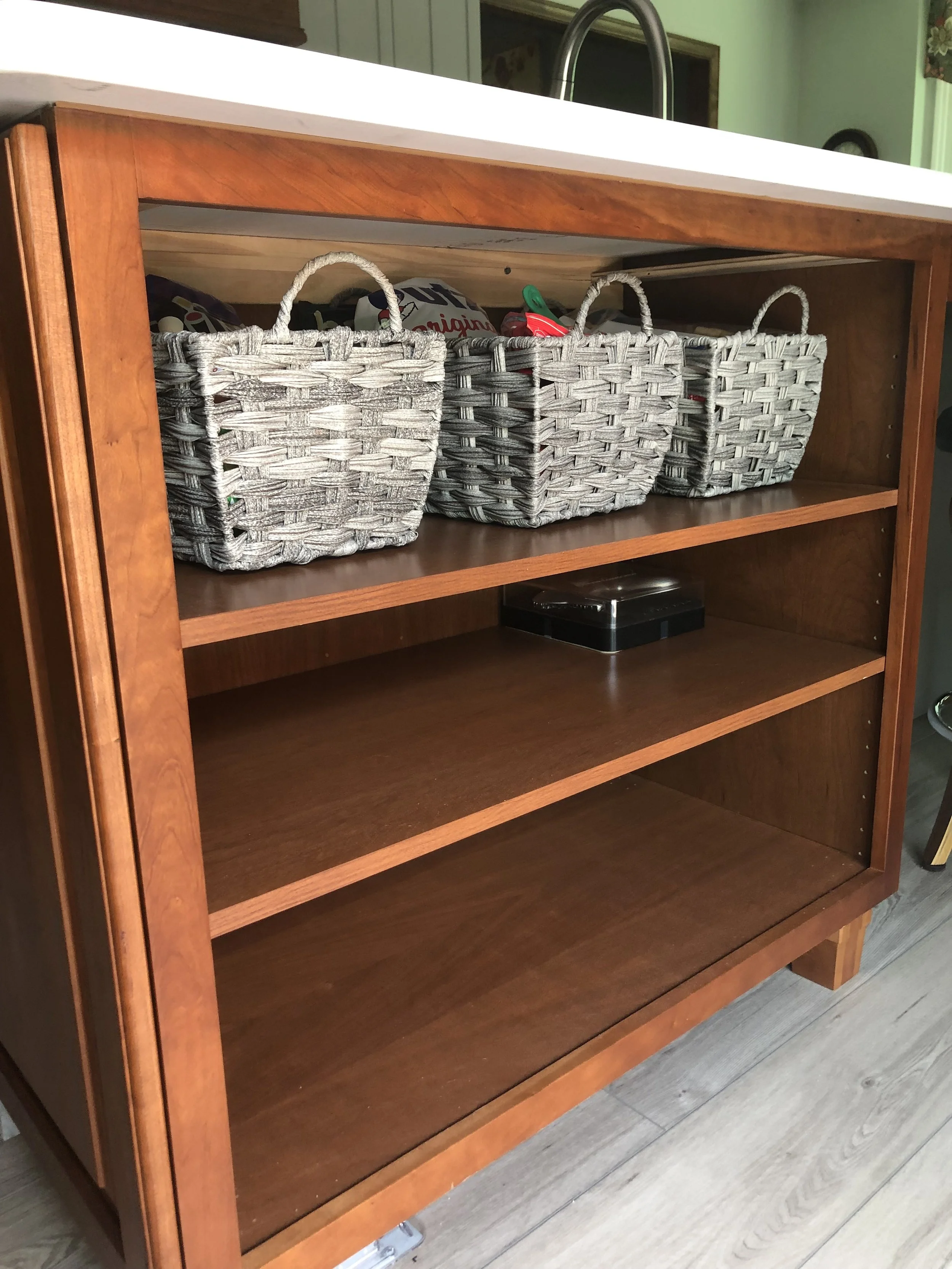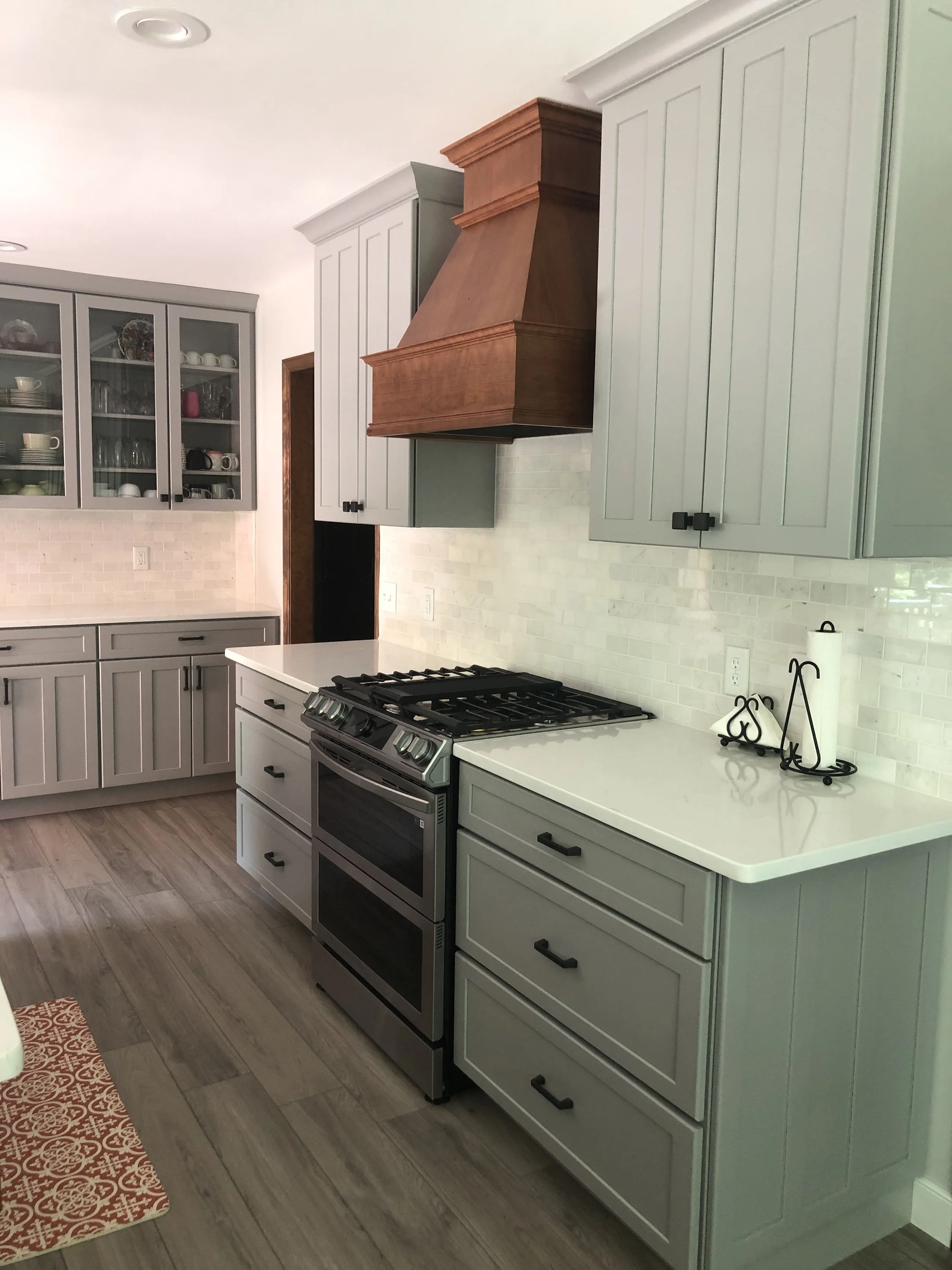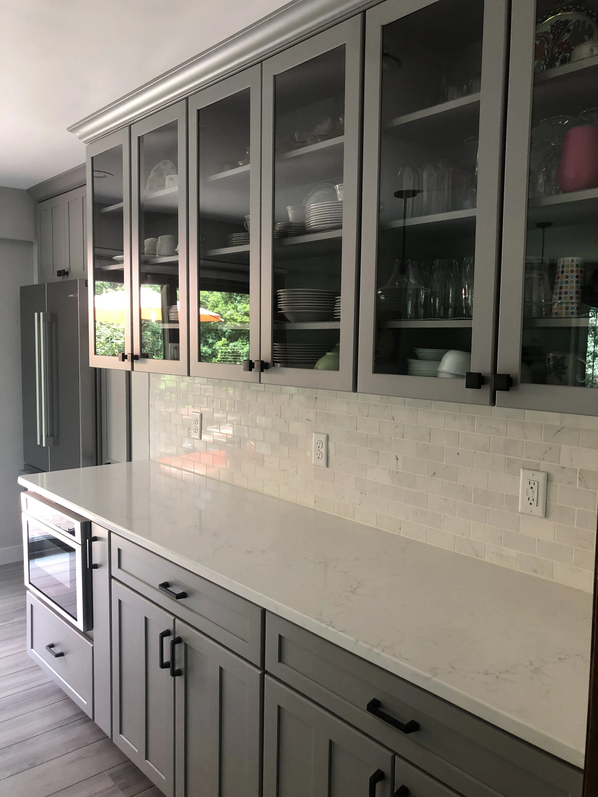 They love it because it has so much storage. They especially like the wall of glass doors and the combination of Kraftmaid's Pebble Grey with cherry wood accents.